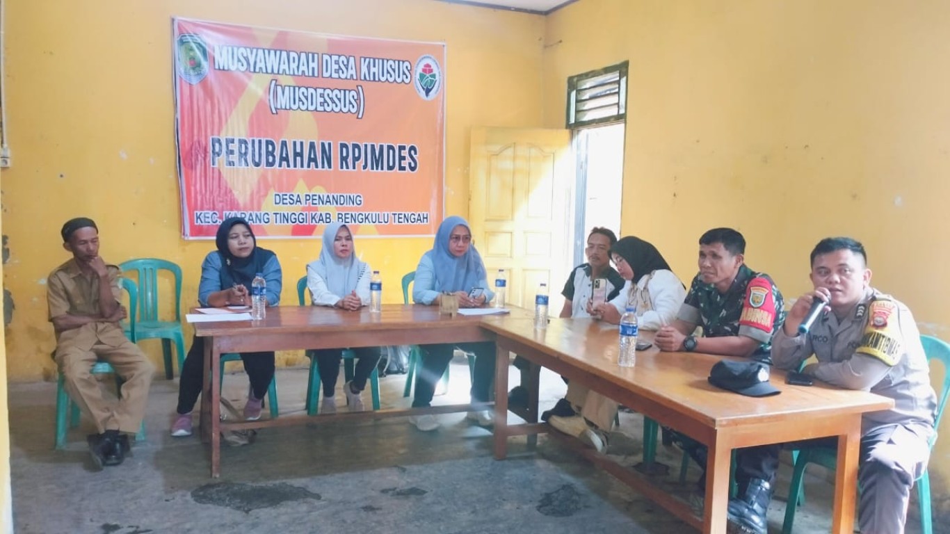 Karang Tinggi (Rabu, 12/02/2025) - Camat Karang Tinggi yang diwakili oleh Kasi PMD Kecamatan Karang Tinggi Wilis Tri Nengsih, S. Sos, menghadiri kegiatan Pemetaan Ketahanan Pangan Melalui Musyawarah Desa Khusus (MUSDESUS) Tahun 2025 Desa Penanding Kecamatan Karang Tinggi, Rabu 12 Februari 2025 di Kantor Desa Penanding. Turut hadir dalam kegiatan tersebut Kepala Desa Penanding beserta Perangkat, Ketua serta anggota BPD, Ketua dan Pengurus BUMDes, Pendamping desa, Penyuluh Pertanian, bhabinsa, Bhabinkamtibmas serta para undangan dan perwakilan unsur masyarakat. Musdesus ini merupakan bagian dari upaya pemerintah desa untuk meningkatkan ketahanan pangan yang menjadi salah satu isu utama dalam pembangunan desa. Mengingat pentingnya sektor pangan bagi kesejahteraan masyarakat, musyawarah ini bertujuan untuk menggali potensi lokal dan mencari solusi yang tepat guna mewujudkan kemandirian pangan di Desa Penanding.