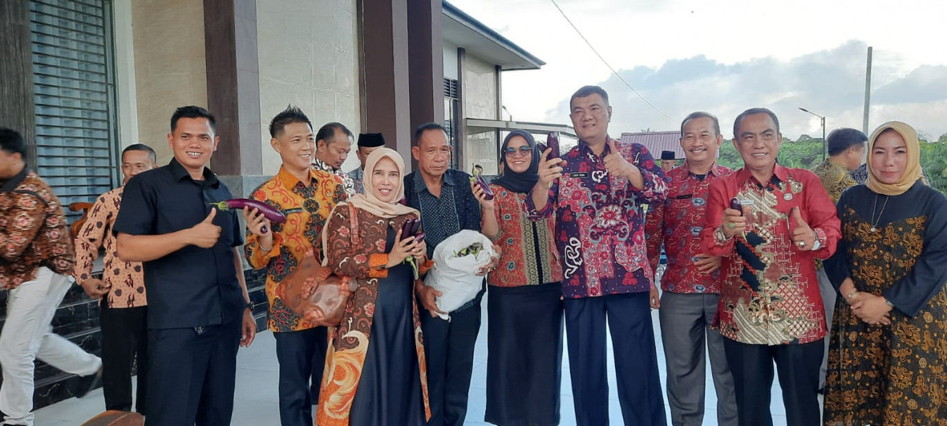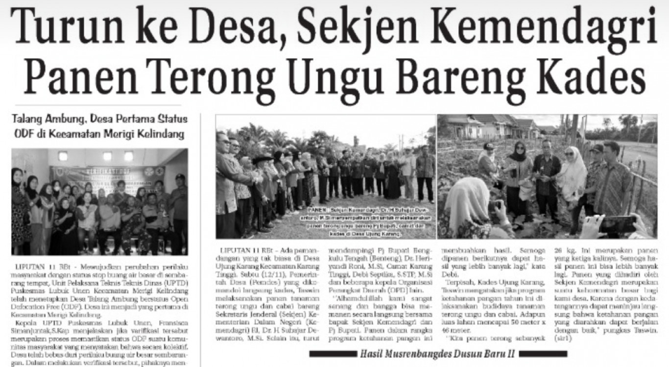 Setelah menghadiri dan memberikan pemaparan pada kegiatan Launching dan Internalisasi Core Values BerAKHLAK Employer Branding ASN Di Lingkungan Pemerintah Kabupaten Bengkulu Tengah yang dilaksanakan di Grage Hotel Bengkulu. Sekretaris Jenderal (Sekjen) Kementerian Dalam Negeri (Kemendagri) RI Dr. H. Suhajar Diantoro, M. Si didampingi PJ. Bupati Bengkulu Tengah Dr. Heriyandi Roni, M. Si, Camat Karang Tinggi Deby Septika, S. STP., M. Si bersama camat lainnya dan beberapa Kepala Organisasi Perangkat Daerah (OPD) di Pemerintah Kabupaten Bengkulu Tengah, melakukan tinjauan ke Gedung Dekranasda Bengkulu Tengah dan dilanjutkan dengan tinjauan tanaman ketahanan pangan di lingkungan Rumah Dinas Bupati Bengkulu Tengah serta Program Ketahanan Pangan Desa Ujung Karang Kecamatan Karang Tinggi sekaligus melakukan panen terong ungu bersama pihak Pemerintah Desa Ujung Karang (Kades, Perangkat dan PKK).